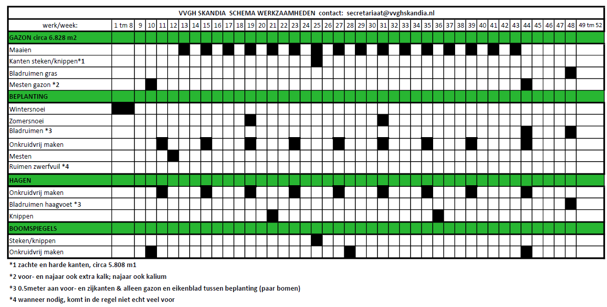 Bestuur en groencommissie werken (in opdracht van de VVGH Skandia) samen met een hoveniersbedrijf (P&P) en een boomdeskundige (Tree-d). We hebben steeds contact met elkaar en spreken regelmatig de werkzaamheden door.